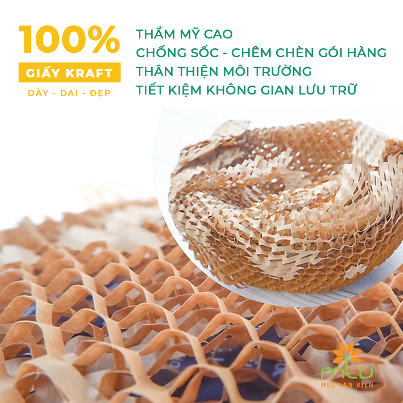 - Tiết kiệm không gian lưu trữ: Một cuộn giấy kraft tổ ong khi lưu trữ có thể tiết kiệm không gian gấp 10 lần so với bóng khí có cùng thể tích chống sốc; 1 mét giấy tổ ong có thể kéo giãn ra được 1.5m giấy chèn so với 1m bóng khí.