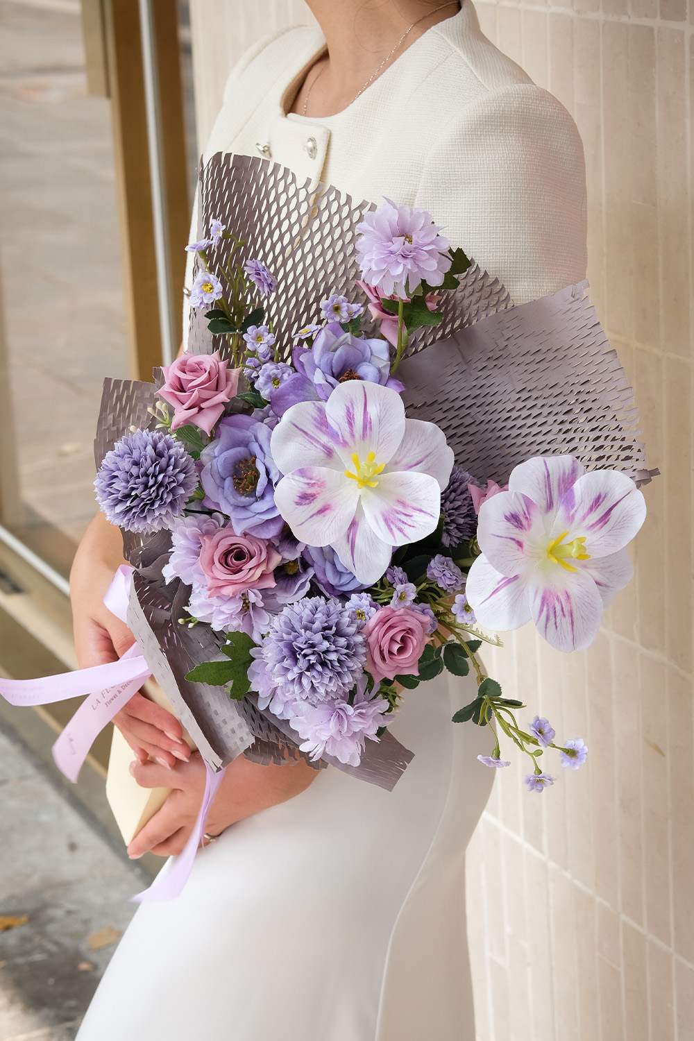 Sử dụng hoa văn: Giấy gói có hoa văn hoặc họa tiết có thể tạo thêm chiều sâu và sự thú vị. Hãy chắc chắn rằng màu sắc trong hoa văn tương hợp với màu hoa. Thêm các phụ kiện: Để tăng thêm sự sinh động, bạn có thể kết hợp ruy băng hoặc các yếu tố trang trí khác có màu sắc hài hòa với giấy gói.