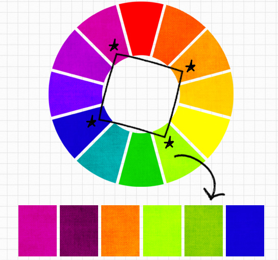 Nguyên tắc này liên quan đến việc chọn bốn màu sắc nằm ở bốn điểm đỉnh của một hình vuông trong bánh xe màu. Khi sử dụng bốn màu này, bạn có thể áp dụng cách phối hợp để tạo ra sự cân bằng. Một hoặc hai màu có thể được sử dụng như màu chủ đạo, trong khi các màu còn lại đóng vai trò như màu nhấn.